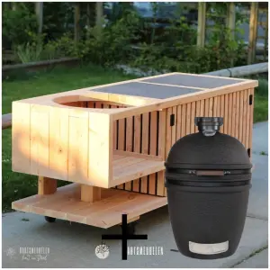 Unieke, moderne uitstraling door de verticale douglas houten latjes. Voor diverse kamado’s.