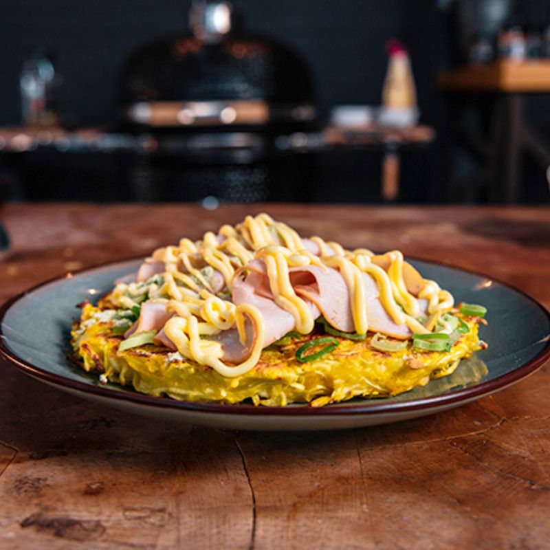 Japanse Pannenkoek op teppanyaki plaat.