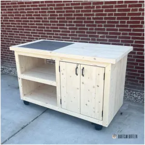 Steigerhouten buitenkeuken Seff. Zoek jij een stoere tafel voor jouw kamado? Wat dacht je van deze buitenkeuken van steigerhout met een stalen frame. Deze stoere buitenkeuken staat op zwarte wielen. Een stoere buiten keuken met open vakken.