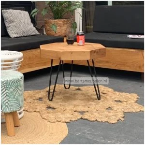 Deze prachtige eikenhouten salontafel Leroy is gemaakt van massieve eikenhouten planken van +/- 40 mm dik en heeft een onderstel van zwart steigerbuis. Tussen de opties kiest u zelf de afmetingen.