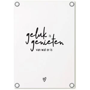 Met deze witte tuinposter met de tekst: geluk is genieten van wat er is, breng je sfeer in je tuin of onder je veranda! Vrolijk je balkon of kale schutting op met een tuinposter met quote. De tuinposter is geschikt voor buitengebruik en kan het hele jaar door buiten blijven hangen. Leuk ook om te combineren met de buitenkussens!