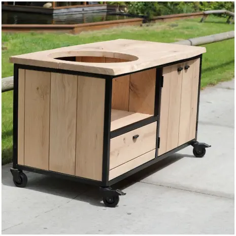 De combinatie van het zwart stalen frame en de zwarte Kamado van Yakiniku ( niet standaard meegeleverd bij dit product ) staan prachtig. Het rustieke eikenhout zorgt dat de zwarte details nog mooier naar voren komen. Bovendien staat hij op stoere volledig zwarte wielen. Een stoer en geliefd ontwerp uit eigen werkplaats.