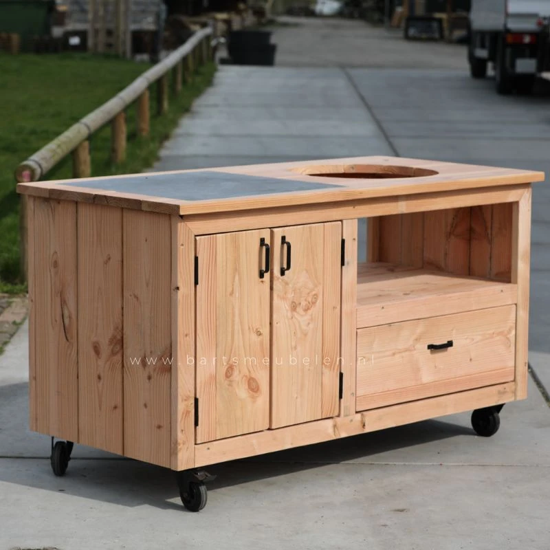 Deze buitenkeuken van douglas is perfect voor de kamado bbq. Een combinatie van een open deel waar de kamado in past met hieronder een lade. Bovendien heb je aan de andere kant een opbergkast met legplank. Bovendien ligt er in het blad een keramische, antracietgrijze tegel van 60x60cm.