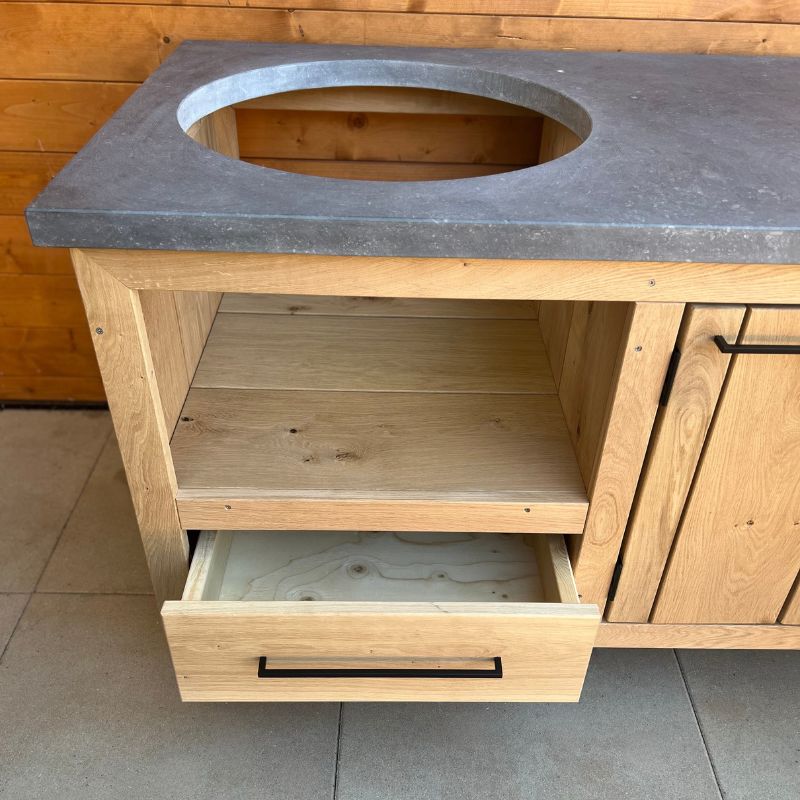 Onze nieuwste aanwinst in het buitenkeuken assortiment is deze exclusieve buitenkeuken van eikenhout met belgisch hardstenen blad. Plaats er jouw eigen kamado in of kies voor een combi-deal. Zo heb je het ideale meubel om ook buiten te koken in stijl.
