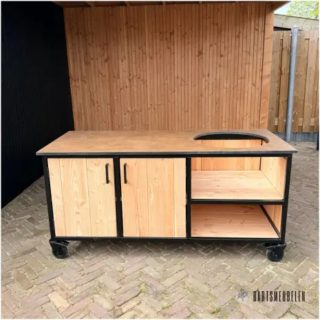 Buitenkeuken met opbergkast 180 cm HPL blad Koper. Het onderhoudsarme werkblad is ideaal voor buitengebruik. Het Douglas hout wordt gecombineerd met een mat zwart stalen frame voor een warme en moderne uitstraling. De dubbele opbergkast biedt ruime opbergruimte voor accessoires. Verrijdbaar en geschikt voor vrijwel alle large kamado’s.