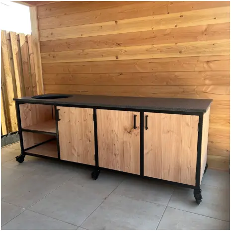 Deze 250cm lange buitenkeuken is gemaakt van massief douglashout en zwart gepoedercoat staal. De opbergkasten onderin bieden veel ruimte voor barbecue accessoires, houtskool en andere benodigdheden die je graag uit het zicht opbergt. Ook heb je door het grote, granieten werkblad veel praktische werkruimte naast je kamado. Door de 6 stoere, zwarte zwenkwielen verplaats je deze buitenkeuken gemakkelijk naar de gewenste plaats in de tuin.