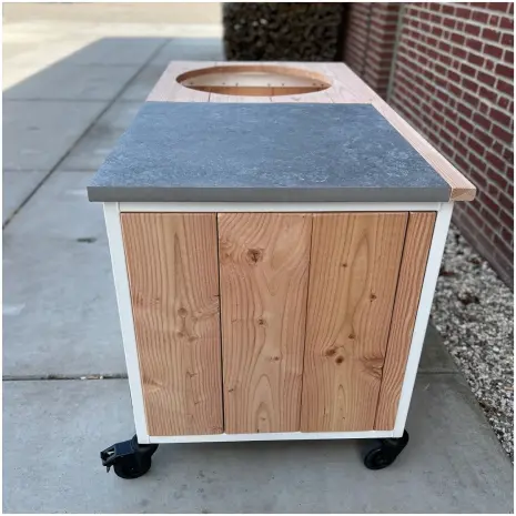De Douglas buitenkeuken sprundel maatwerk is een voorraadmodel dat direct leverbaar is. Deze buitenkeuken is geschikt voor de Bastard VX Large, de Bastard Large en de Yakiniku Large kamado. Het model is uitgevoerd in douglas hout, gecombineerd met een wit stalen frame met poedercoating en een keramische tegel.