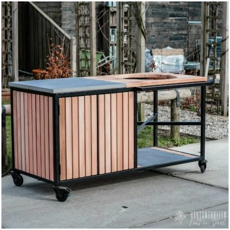 Ontdek onze eucalyptus houten buitenkeuken latjes met tegel met opbergruimte en plaats voor jouw medium of large kamado. Deze moderne buitenkeuken is gemakkelijk te verplaatsen door de stevige, zwarte zwenkwielen en verplaats je daardoor makkelijk naar iedere gewenste plek in de tuin.