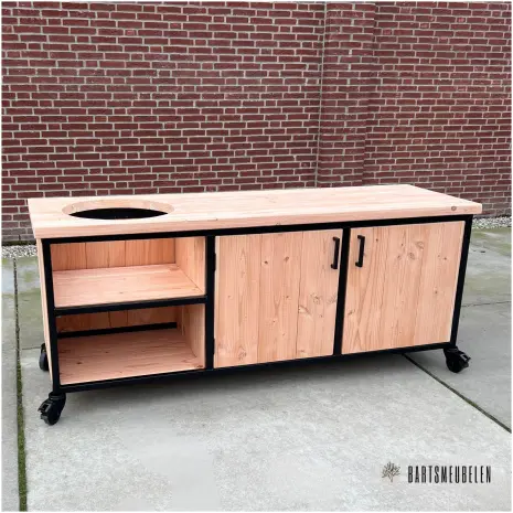 Zoek jij nog een stoere buitenkeuken voor de kamado barbecue? Wat dacht je van deze industriele tafel op zwarte wielen. Met een stoer stalen frame voor de buitenkeuken voorzien van een matzwarte poedercoating. Bovendien wordt dit model wordt ingelegd met het populaire houtsoort: douglas en biedt het veel opbergruimte.