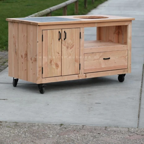 Buitenkeuken Brendanย is gemaakt van douglas hout. Achter de deurtjes vindt je een legplank waardoor je 2 vakken hebt. Daarnaast heb je onder de kamado ook nog een lade. Zo heb je voldoende ruimte om al je accessoires op te ruimen. Bovendien heb je in het werkblad ook nog eens een antraciet grijze keramische tegel.