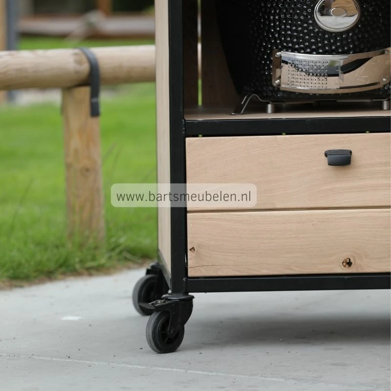 Deze buitenkeuken wordt gemaakt van massief eikenhout in combinatie met een stalen frame voorzien van een zwarte poedercoating. Bovenop de buitenkeuken ligt een massief eikenhouten blad van 40 a 45mm dik met boomstam gegolfde randen, wat het totaal nog meer outdoor feeling geeft. Verder heb je een handige opbergkast en lade. Bovendien staat de bbqtafel op wielen voor gemakkelijke verplaatsing. Lees hier alles over bbq tafel industrieel eiken Jim.
