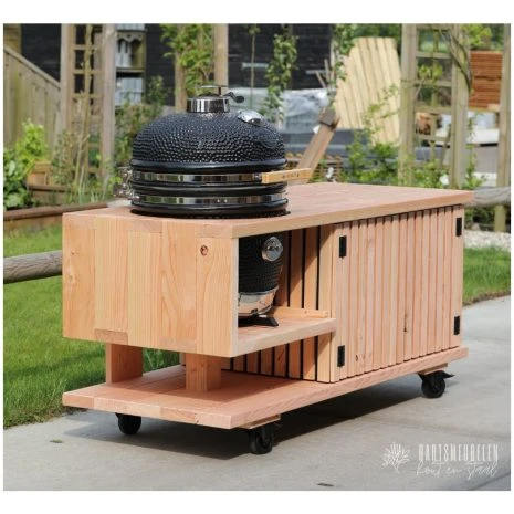 Zoek jij nog een moderne buitenkeuken op wielen voor in de tuin? Wat dacht je van deze latjes buitenkeuken van warm douglashout. Hierin plaatsen wij de Kamado Large Zwarte Kamado van Yakiniku. Een prachtig model met rvs-afwerking, wat heel handig is in onderhoud. Wij zullen bij ons in de werkplaats de kamado voor je plaatsen in de latjes buitenkeuken op ons eigen stevige kamado-tafel-frame. Zodat je na levering direct klaar bent om te grillen!