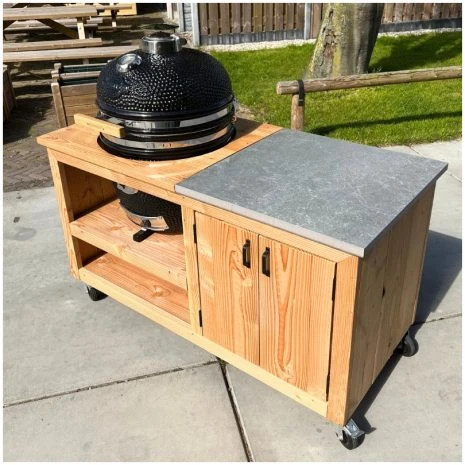 Kamado tafel douglas 150×70 is gemaakt van douglas hout en heeft bovenop een antracietgrijze keramische tegel van 70x70x3cm. Achter de deurtjes vindt je een legplank waardoor je 2 vakken hebt. Daarnaast heb je onder de kamado ook nog een open vak. Zo heb je voldoende ruimte om al je accessoires op te ruimen.