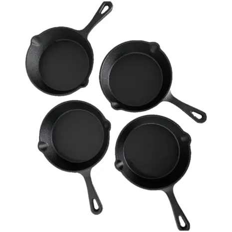 Vier mooie degelijke gietijzeren koekenpannen in klein formaat. Zo ben je in 1 keer klaar! Perfect voor het maken van soufflés, scrambled eggs, kleine maaltijden, bijgerechten of desserts. De pannen zijn geweldig om te sauteren, voor de bereiding van sausen, en om taarten in te bakken enz. In de oven of op de BBQ, het kan allemaal. De skillets zijn al geseasoned, dus klaar voor gebruik!