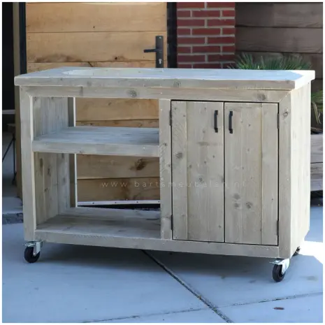 De buitenkeuken is krachtig uit gebruikt steigerhout, een materiaal dat populair is door zijn robuuste, robuuste uitstraling. De hoge uitvoering maakt comfortabel werken, zonder bukken, en biedt voldoende ruimte voor: