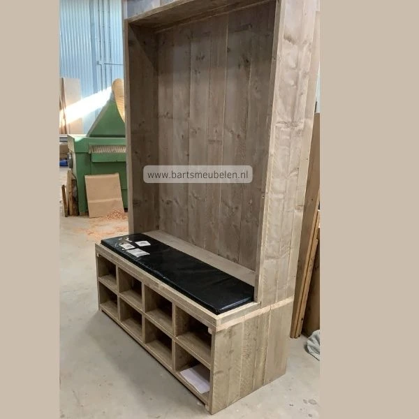 Deze garderobekast wordt gemaakt van steigerhout. De kast voor de hal heeft onderin 8 open vakken en op het bankje kun je heerlijk zitten. Bovendien stel je hem hieronder naar eigen wens samen.