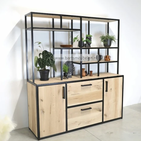 Buffetkast industrieel Robin heeft kastdeuren, lades en open vakken en is perfect voor de woonkeuken. Een mooie grote opbergkast met veel ruimte. Stel hem hieronder naar eigen wens samen.