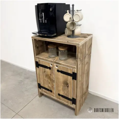 Mis je nog opbergruimte in de keuken voor bijvoorbeeld uw koffiezetapparaat? Bovenop dit steigerhouten koffiekastje is voldoende ruimte voor je koffiezetapparaat. Ook vindt je hieronder voldoende opbergruimte voor je kopjes en andere benodigdheden.