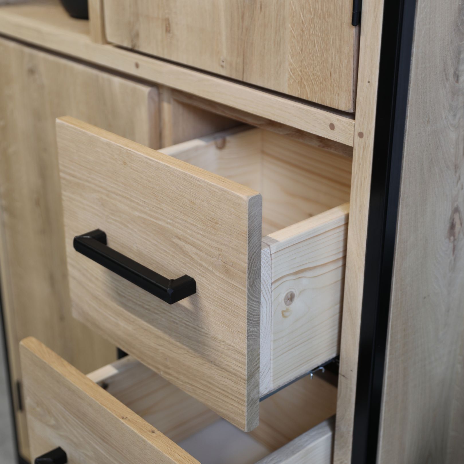 De industriële kast Freek is een stijlvolle kast van eikenhout en staal met een tijdloos ontwerp. Dankzij de combinatie van drie lades, twee deuren en legplanken biedt deze kast zowel praktische opbergruimte als een stijlvolle toevoeging aan elk interieur. Met zijn strakke lijnen en duurzame materialen past de kast Freek moeiteloos in moderne, landelijke en industriële woonstijlen.