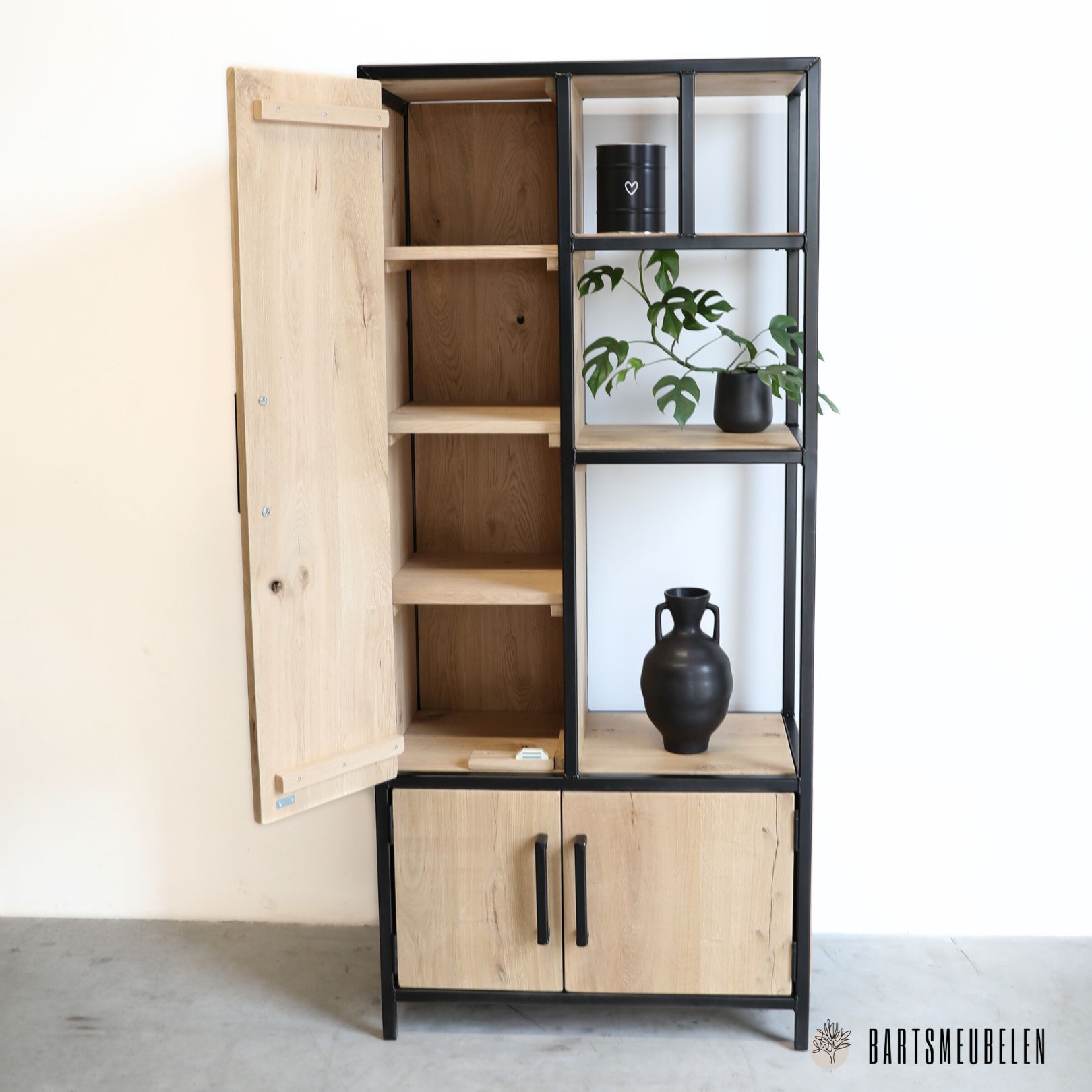 De industriële kast Jesper wordt op bestelling gemaakt, zodat je zelf de gewenste afmetingen kunt bepalen. Of je nu kiest voor een kleinere variant voor de hal of een hoge uitvoering voor de woonkamer, het ontwerp blijft altijd in balans.