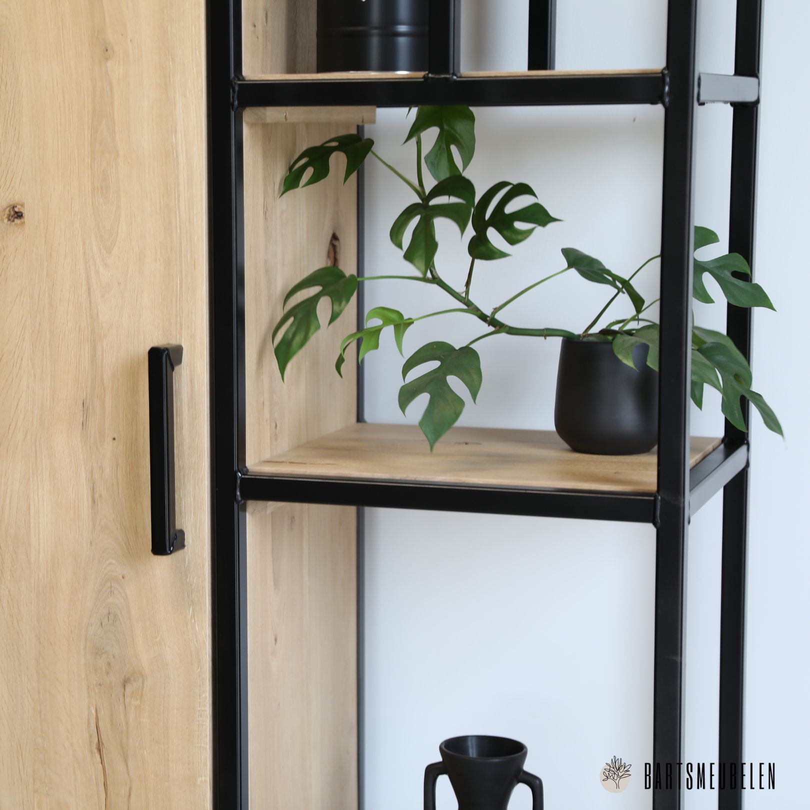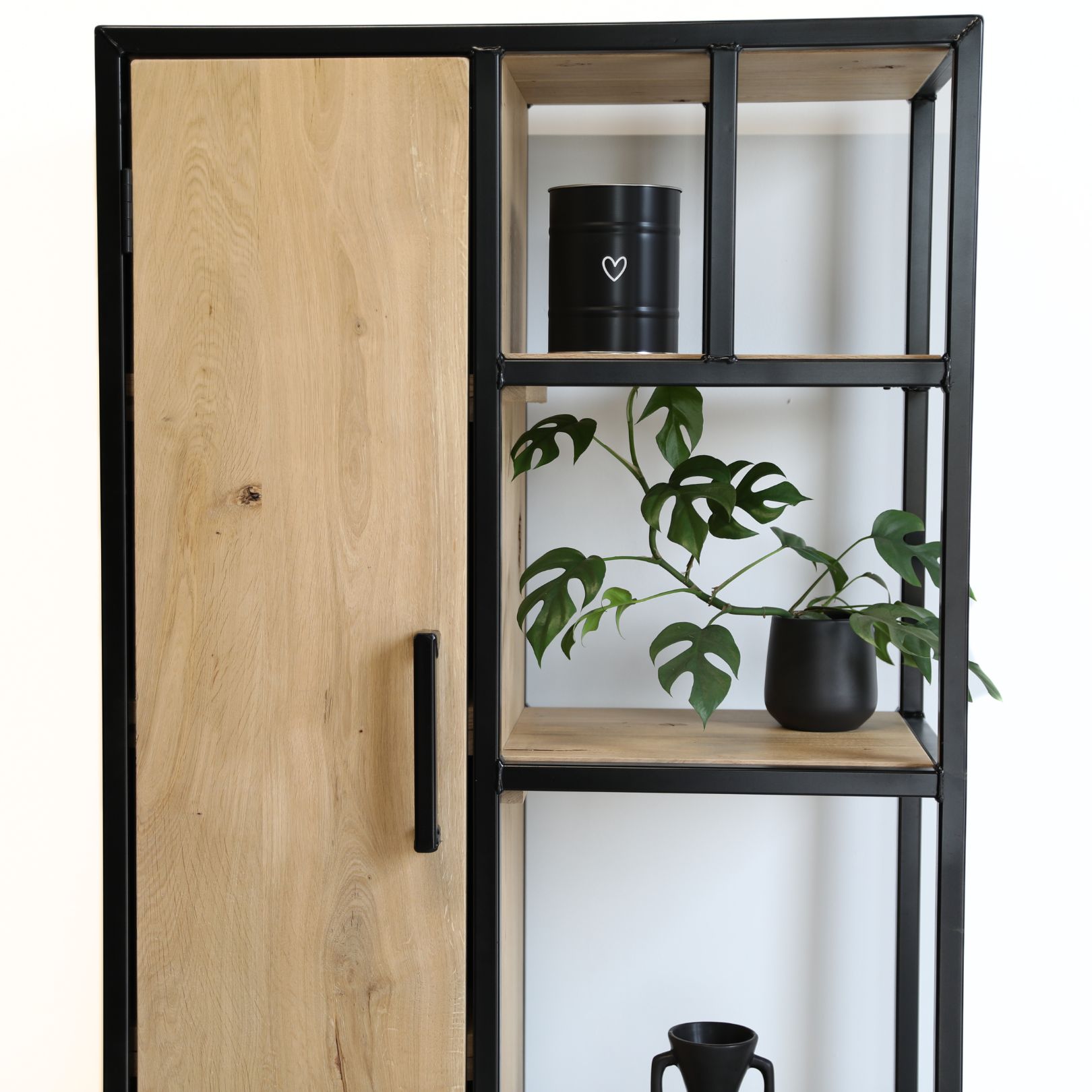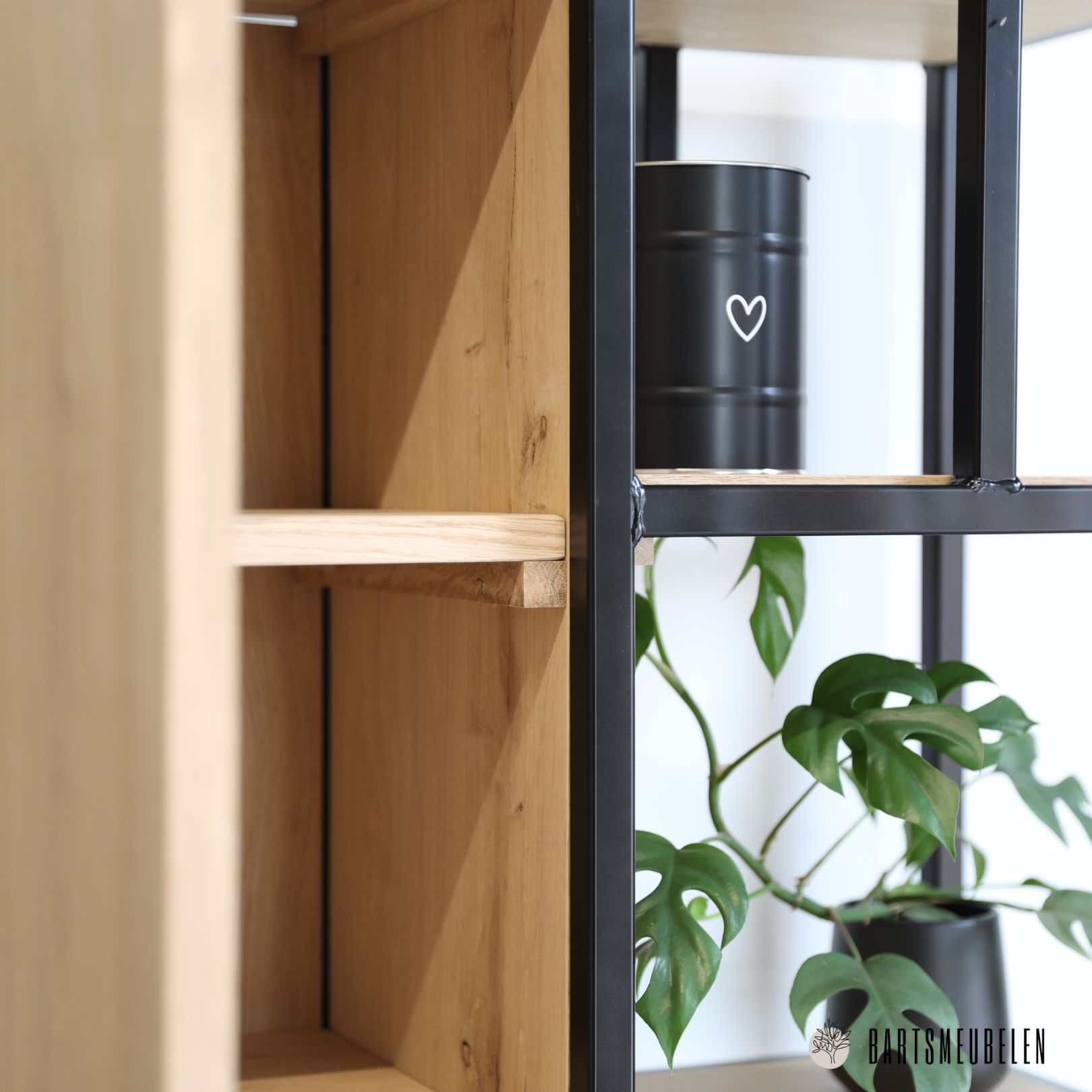 De industriële kast Jesper is een stijlvolle combinatie van eikenhout en staal. Het ontwerp bestaat uit open vakken, gesloten kastdeuren en een hoge opbergruimte, waardoor deze kast zowel praktisch als decoratief is. Dankzij het speelse lijnenspel van staal en hout past de kast moeiteloos in moderne en industriële interieurs.