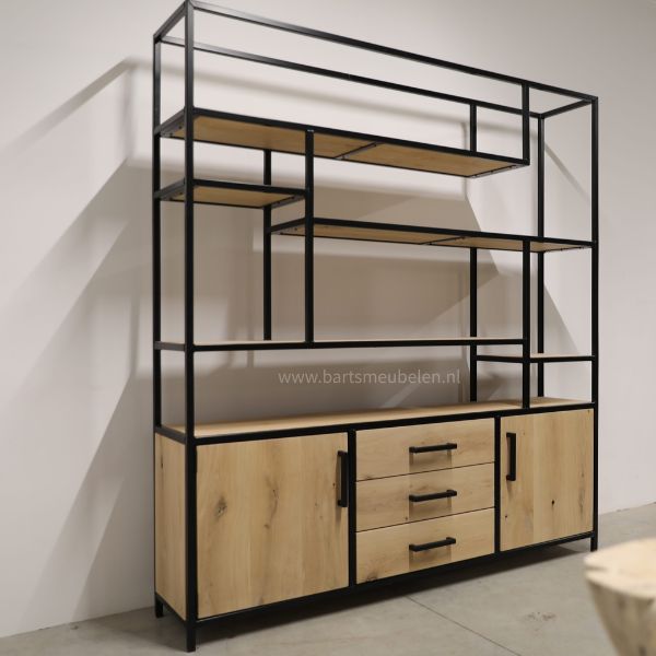 Industriële kast Raf van eikenhout en staal. Met drie lades, twee deuren en open vakken voor extra opbergruimte. Tijdloos ontwerp, ook verkrijgbaar in maatwerk.