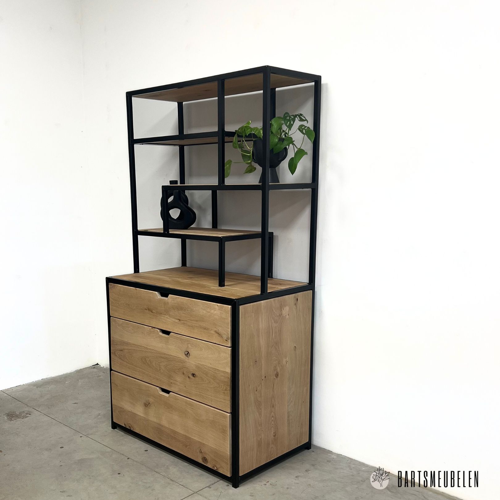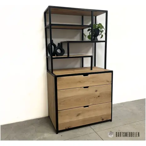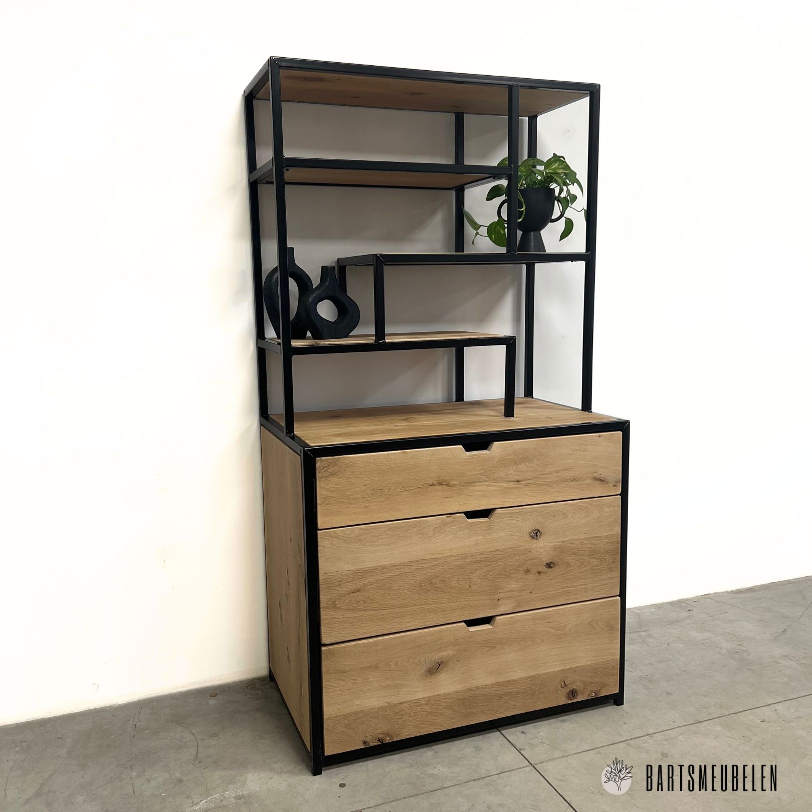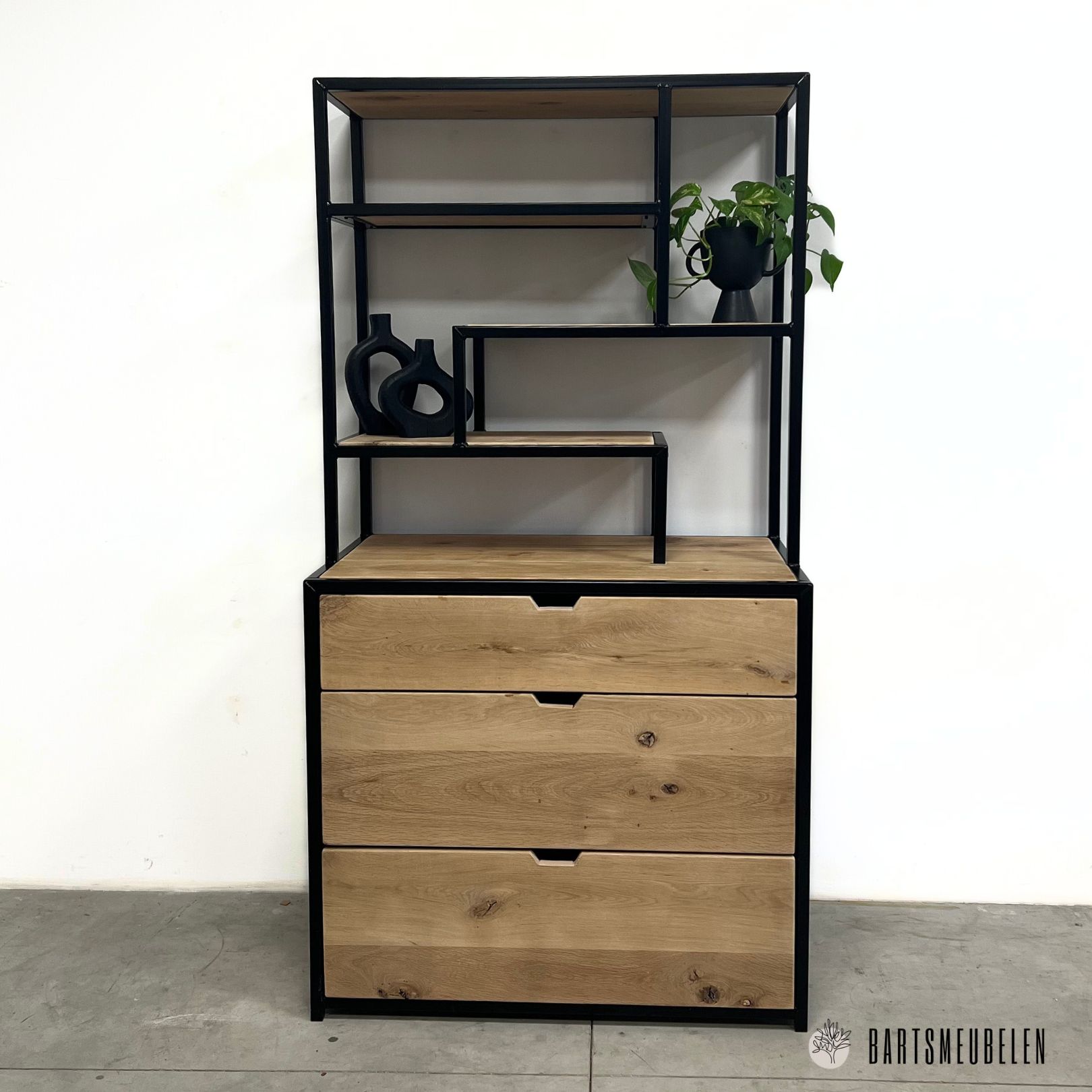 Wat een prachtige aanvulling op ons assortiment. Deze kast van eikenhout en staal, Claudia. De grote lades i.c.m. met de stoere vakkenverdeling bovenin maken deze kast een stoere aanwinst voor uw interieur. Stel hem nu zelf samen tussen de opties.