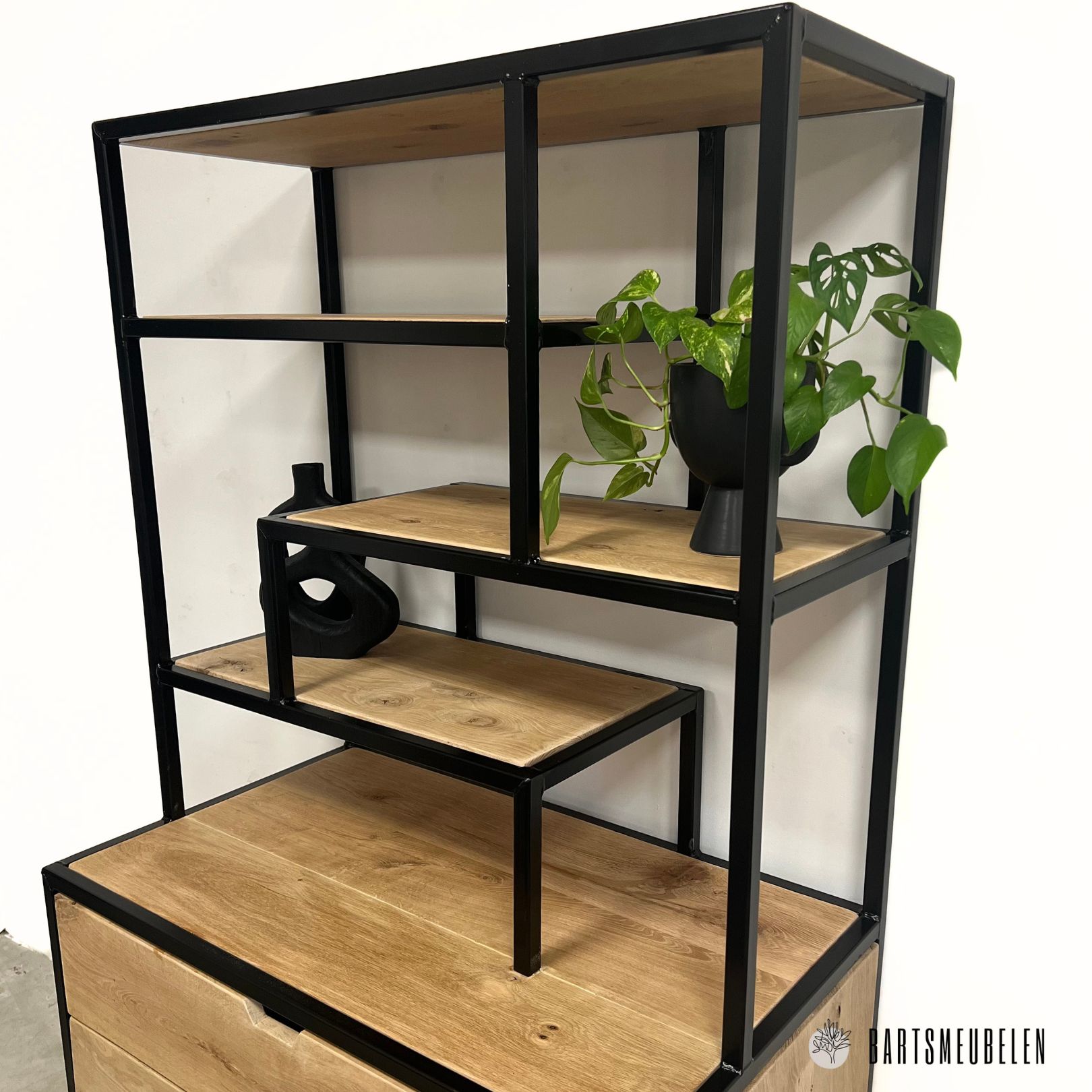 In deze kast van hout en staal heeft u veel opbergruimte. Maar bovenin deze kast vindt u ook open vakken om de kast gezellig aan te kleden en uw mooiste accessoires of planten in weg te zetten.