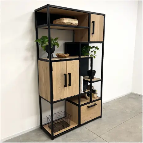 De industriële vakkenkast Zev is een veelzijdige kast met een strakke uitstraling met open en dichte vakken. Door het gebruik van massief eikenhout en een slank stalen frame past deze vakkenkast perfect in een industrieel of modern interieur. De vaste indeling zorgt voor een rustige uitstraling, terwijl de kast voldoende ruimte biedt voor opbergen en decoratie.