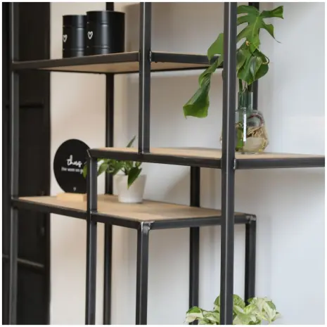 Onze vakkenkast eikenhout en staal combineert een stevig stalen frame met prachtige eikenhouten planken. De slanke kokermaat in combinatie met het massieve eikenhout maakt deze speelse vakkenkast stevig en stijlvol.