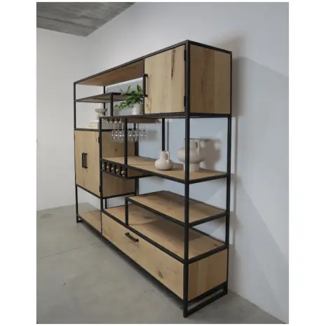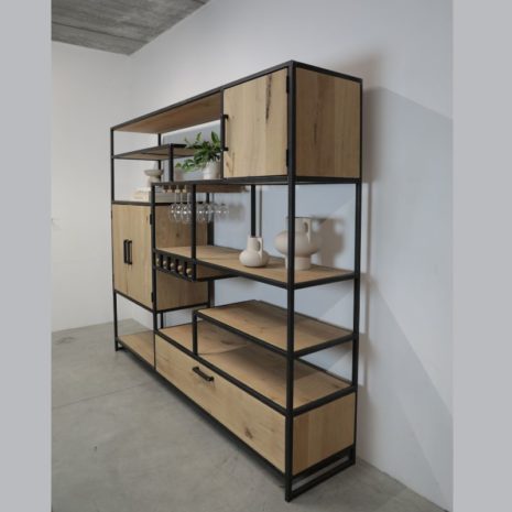 Deze industriele wandkast is 210cm hoog x 250cm breed en 50cm diep. In de open vakken heb je ruimte voor mooie woonaccessoires of servies terwijl je in de dichte vakken spullen uit het zicht kunt opbergen. Verder heb je de mogelijkheid enkele wijnglazen op te hangen en natuurlijk de open ruimtes voor het plaatsen van je favoriete wijnflessen.