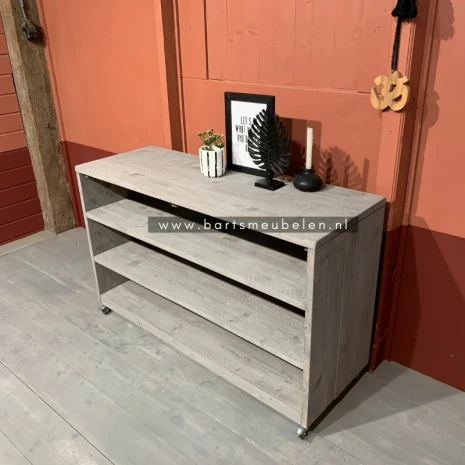 Deze kast met legplanken heeft 3 open vakken met een open achterzijde. Een fijne, stoere kast op wieltjes van steigerhout.