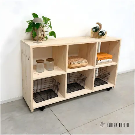 Deze houten kast met 6 open vakken staat op wielen. In deze kast kun je leuke decoratie / woonaccessoires kunt zetten. Maar natuurlijk kunt u de vakken ook vullen met leuke boekjes of handige opbergmanden.