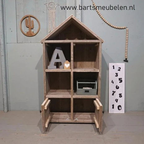 Steigerhouten vakkenkast 8 model huisje. In deze steigerhouten open kast heeft u 4 open vakken + 2 vakken met deurtjes. In dit kastje is genoeg opbergruimte om het mooiste speelgoed van uw kinderen in het zicht te zetten. Daarnaast kan u ook veel spullen uit het zicht opbergen in de vakken met