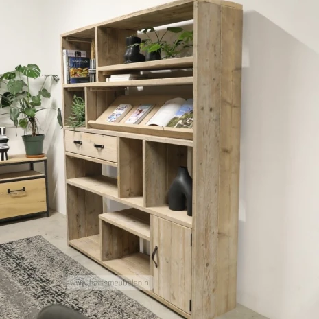 In deze steigerhouten kast heb je voldoende ruimte voor je boeken en woon accessoires. Natuurlijk heb je ook nog een fijne lade voor al je kleine spulletjes. Achter het deurtje verstop je de dingen die je niet in het zicht wilt laten staan.