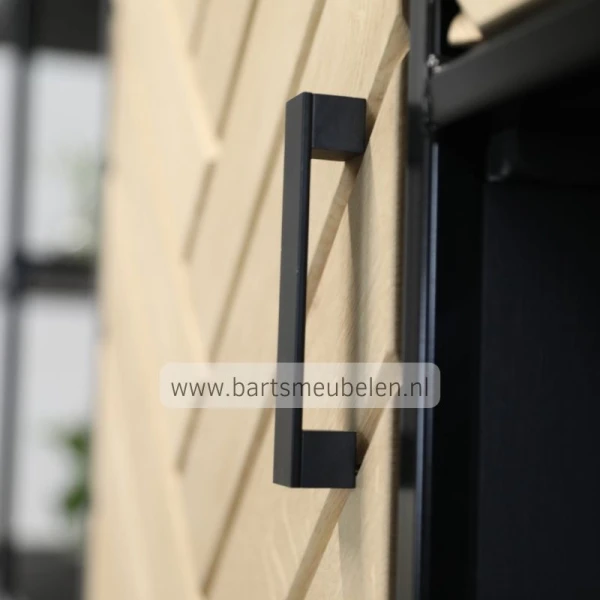 De industriele wandkast met zwarte lades en deuren met visgraat motief.