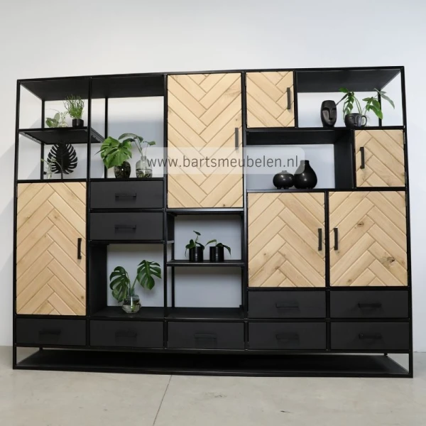 Deze stalen visgraat kast eiken is waanzinnig! Een stalen frame die is ingelegd met rustiek eikenhout. De eikenhouten ladefronten zijn zwart geverfd, de deuren hebben een visgraat patroon en er zijn ook voldoende open vakken. Bekijk dit model ook als: zwarte wandkast met visgraat motief.