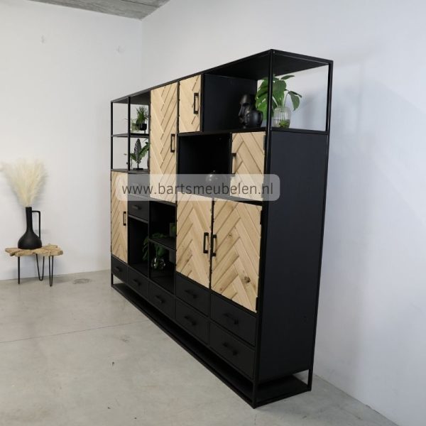 Verder is de industriele wandkast uitgerust met maar liefst 9 lades, 6 deuren met visgraat motief en diverse open vakken. De lades en deuren hebben handgemaakte handgrepen die in dezelfde kleur worden behandeld als het frame.