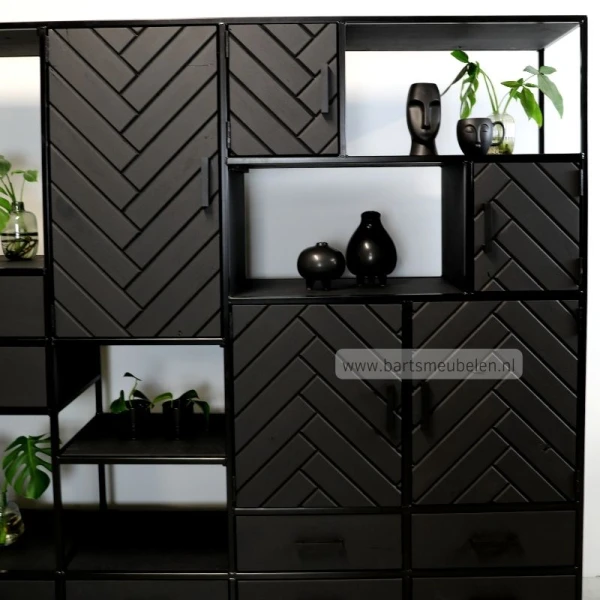 Een zwarte wandkast met lades, deuren met visgraat motief en open vakken.ย Deze visgraat kast zwart is waanzinnig! Een stalen frame die is ingelegd met eikenhout. Het eikenhout is bij deze vakkenkast zwart geverfd voor een unieke uitstraling. Eventueel staat dit model ook online met houtkleurige deuren.