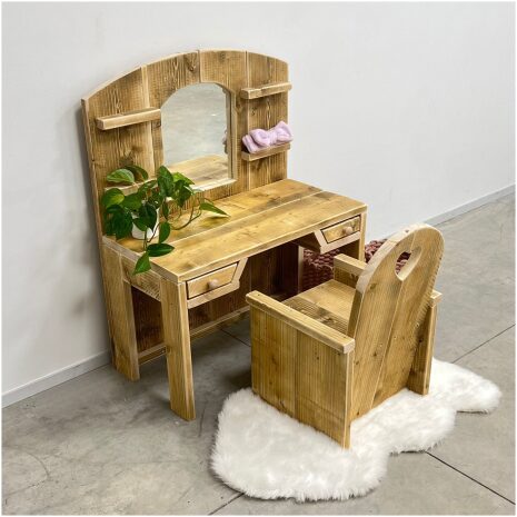 Deze kaptafel is gemaakt van old look steigerhout. Het houten oppervlak wordt meerdere keren geschuurd, zodat het glad en veilig is voor peuters. Kleurbehandeling is optioneel en volledig aanpasbaar naar wens.