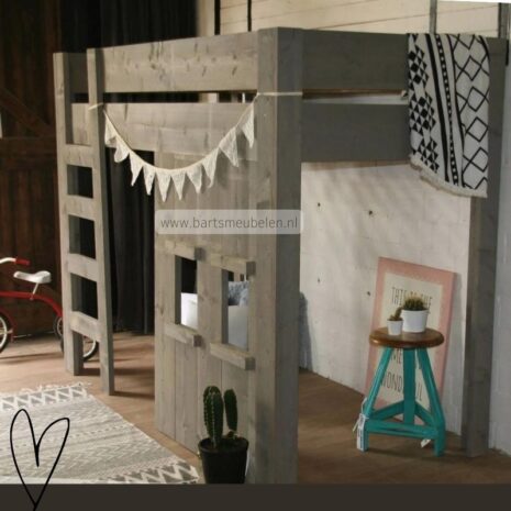 Bij deze steigerhouten hoogslaper pip is ervoor gekozen om de ruimte zo open mogelijk te laten voor een ruimtelijk gevoel. Maar toch een heerlijk plekje onder het bed te creรซren. Zo kan uw kindje met zijn vriendjes en vriendinnetjes onder het bed spelen met een beschut gevoel. Maar komen er door de grote “deuropening” en het “open raam” veel licht binnen.