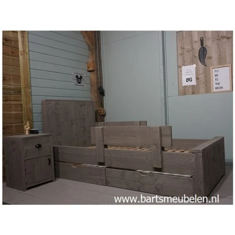 Dit houten bed van steigerhout is een prachtig eenpersoonsbed met opbergruimte onder het bed. Dit kan in de vorm van een matraslade, handig voor logeerpartijtjes of een speelgoedlade voor extra opbergruimte. Stel hem hieronder naar eigen wens samen.
