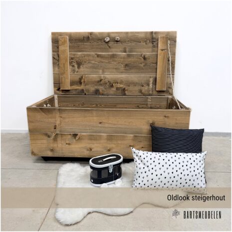 Tussen de opties heeft u de keuze uit nieuw steigerhout, old-look steigerhout en gebruikt steigerhout. De steigerhouten speelgoedkist op de foto met olifant is gemaakt van gebruikt steigerhout. Bij de andere afbeeldingen vindt je de samenstelling terug op de afbeeldingen.