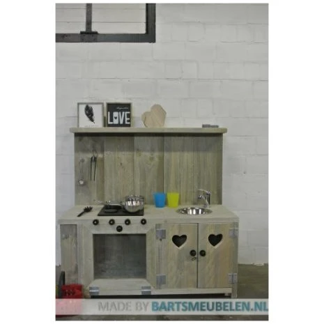 De steigerhouten kinderkeuken op de foto is gemaakt van old look steigerhout en heeft geen kleurbehandeling gehad.