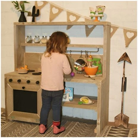 De steigerhouten kinderkeuken op de foto is gemaakt van old look steigerhout en heeft geen kleurbehandeling gehad.