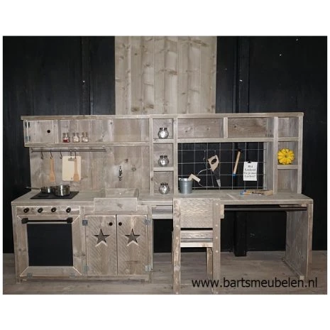 Doordat wij alles op bestelling maken zijn onze speelmeubels voor kinderen grotendeels te personaliseren. Zo kiest u zelf het soort steigerhout, de kleur (bijv. wit, grijs of zelfs roze). En ook voor het ovendeurtje is er een keuze tussen plexiglas of krijtbord. Daarnaast bepaalt u zelf de werkbladhoogte die past bij de leeftijd van uw kleintje(s) en kunt u een figuurtje kiezen.