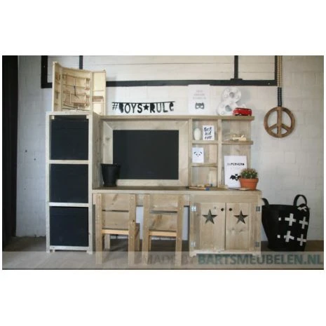 Doordat wij alles op bestelling maken zijn onze speelmeubels voor kinderen grotendeels te personaliseren. Zo kiest u zelf het soort steigerhout, de kleur (bijv. wit, grijs of zelfs roze). En ook voor het ovendeurtje is er een keuze tussen plexiglas of krijtbord. Daarnaast bepaalt u zelf de werkbladhoogte die past bij de leeftijd van uw kleintje(s) en kunt u een figuur kiezen.