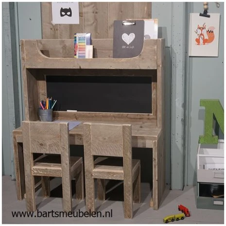 De steigerhouten speelmeubel op de foto is gemaakt van old look steigerhout en heeft geen kleurbehandeling gehad.