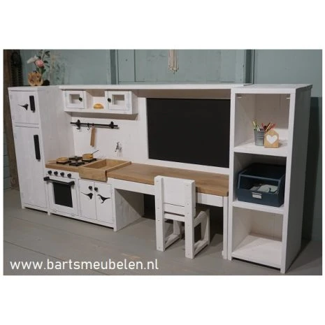 Doordat wij alles op bestelling maken zijn onze speelmeubels voor kinderen grotendeels te personaliseren. Zo kiest u zelf het soort steigerhout, de kleur (bijv. wit, grijs of zelfs roze). En ook voor het ovendeurtje is er een keuze tussen plexiglas of krijtbord. Daarnaast bepaalt u zelf de werkbladhoogte die past bij de leeftijd van uw kleintje(s) en kunt u een figuur kiezen.