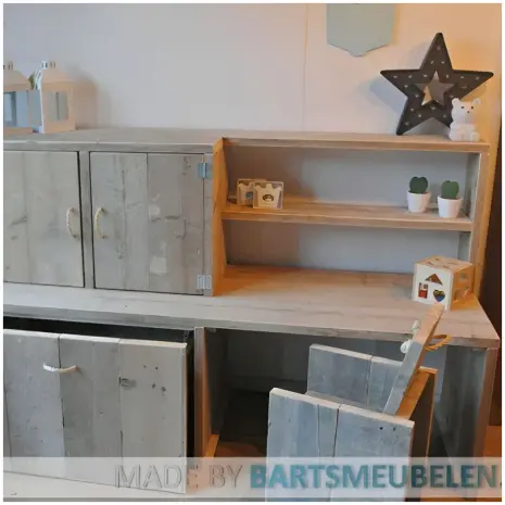Doordat wij alles op bestelling maken zijn onze speelmeubels voor kinderen grotendeels te personaliseren. Zo kiest u zelf het soort steigerhout, de kleur (bijv. wit, grijs of zelfs roze). En ook voor het ovendeurtje is er een keuze tussen plexiglas of krijtbord. Daarnaast bepaalt u zelf de werkbladhoogte die past bij de leeftijd van uw kleintje(s) en kunt u een figuur kiezen.